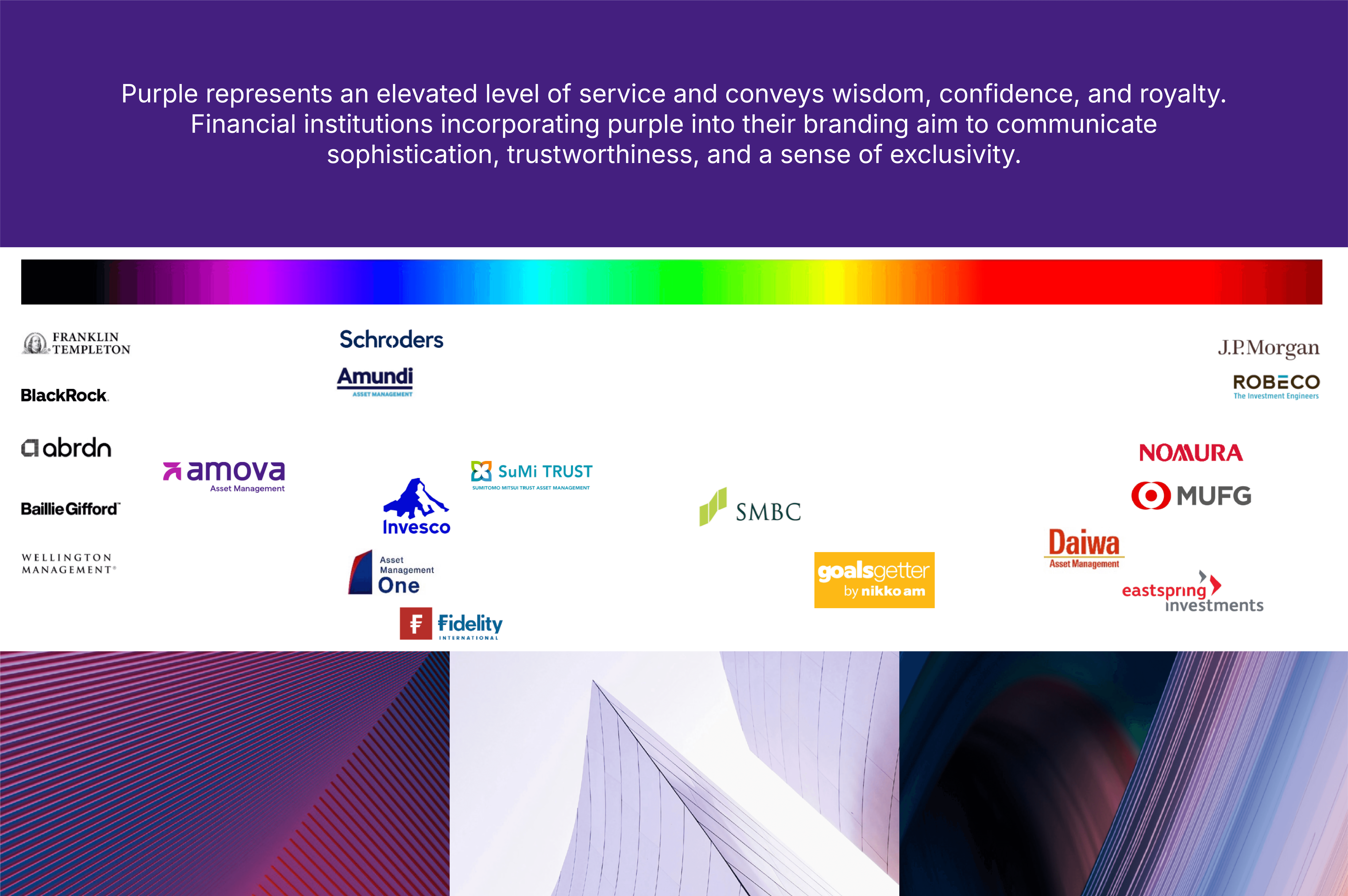 In the financial sector, purple is a courageous choice that signals an elevated level of service. It conveys wisdom, confidence, and a sense of sophisticated exclusivity that traditional blue simply cannot achieve. Crucially, purple is regarded as a premium colour within the Japanese context; its selection serves as a powerful representation of Nikko AM’s storied legacy while pivoting towards a modern aesthetic. Financial institutions incorporating purple into their branding aim to communicate trustworthiness and a premium positioning. The visual elements were developed to feel precise and intentional, reflecting the "Focused Expertise" strategy through clean lines and a balanced composition that feels stable yet dynamic.