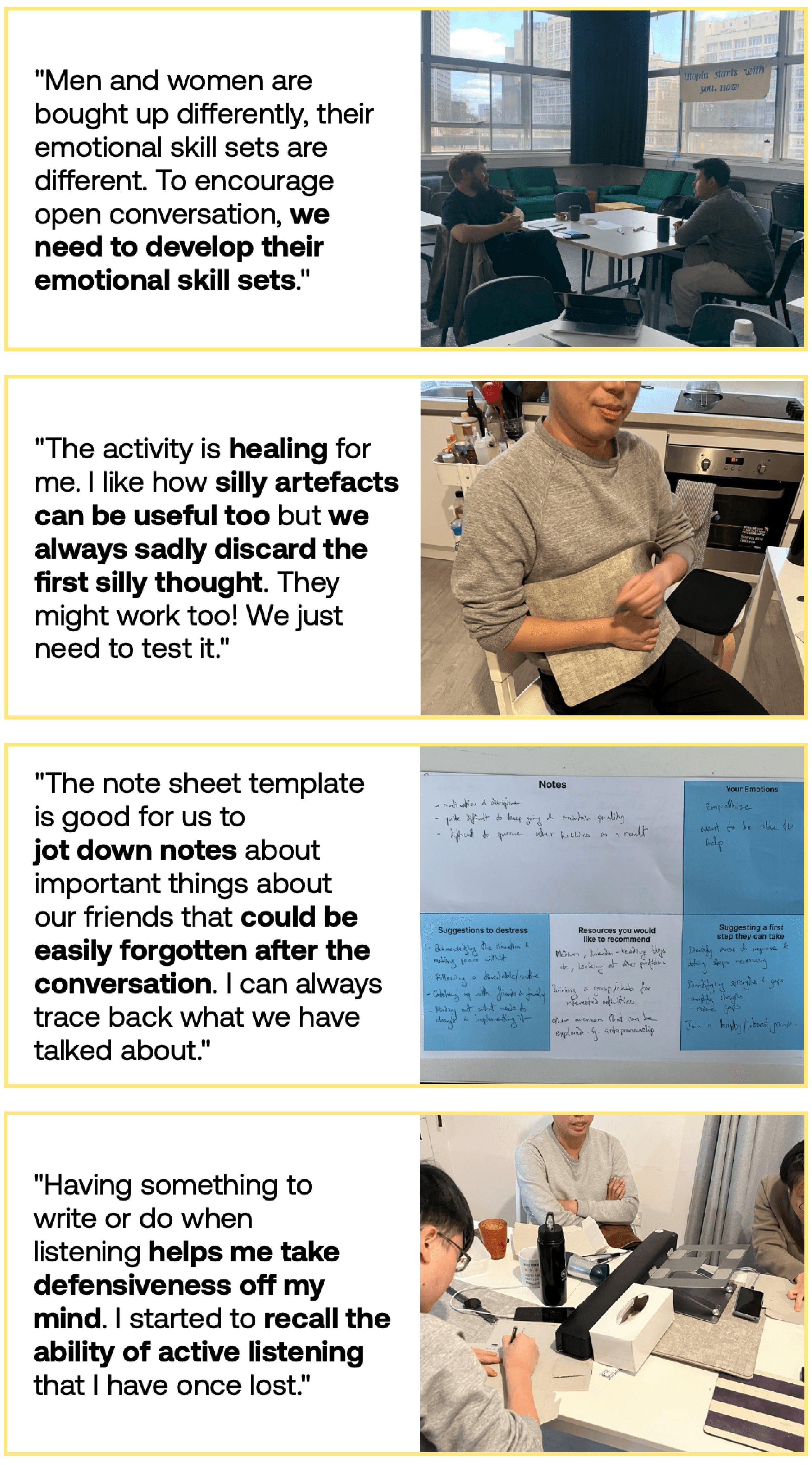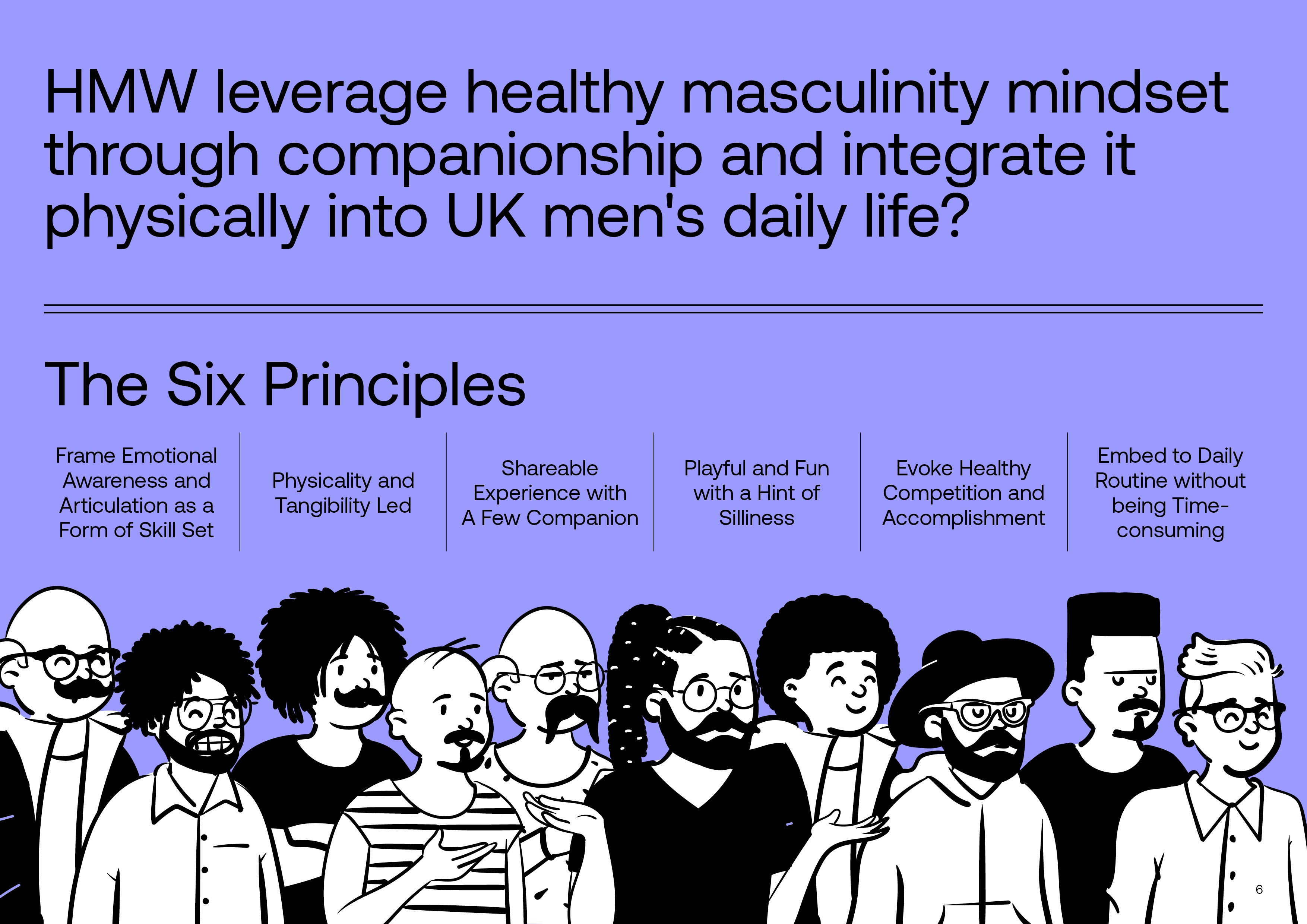 In co-design workshops, we explored what might add value to men’s routines beyond what traditional self-care options already offer, such as gyms, sports clubs, and social groups. These conversations led to the development of six design principles that guided our design direction in the next phase.