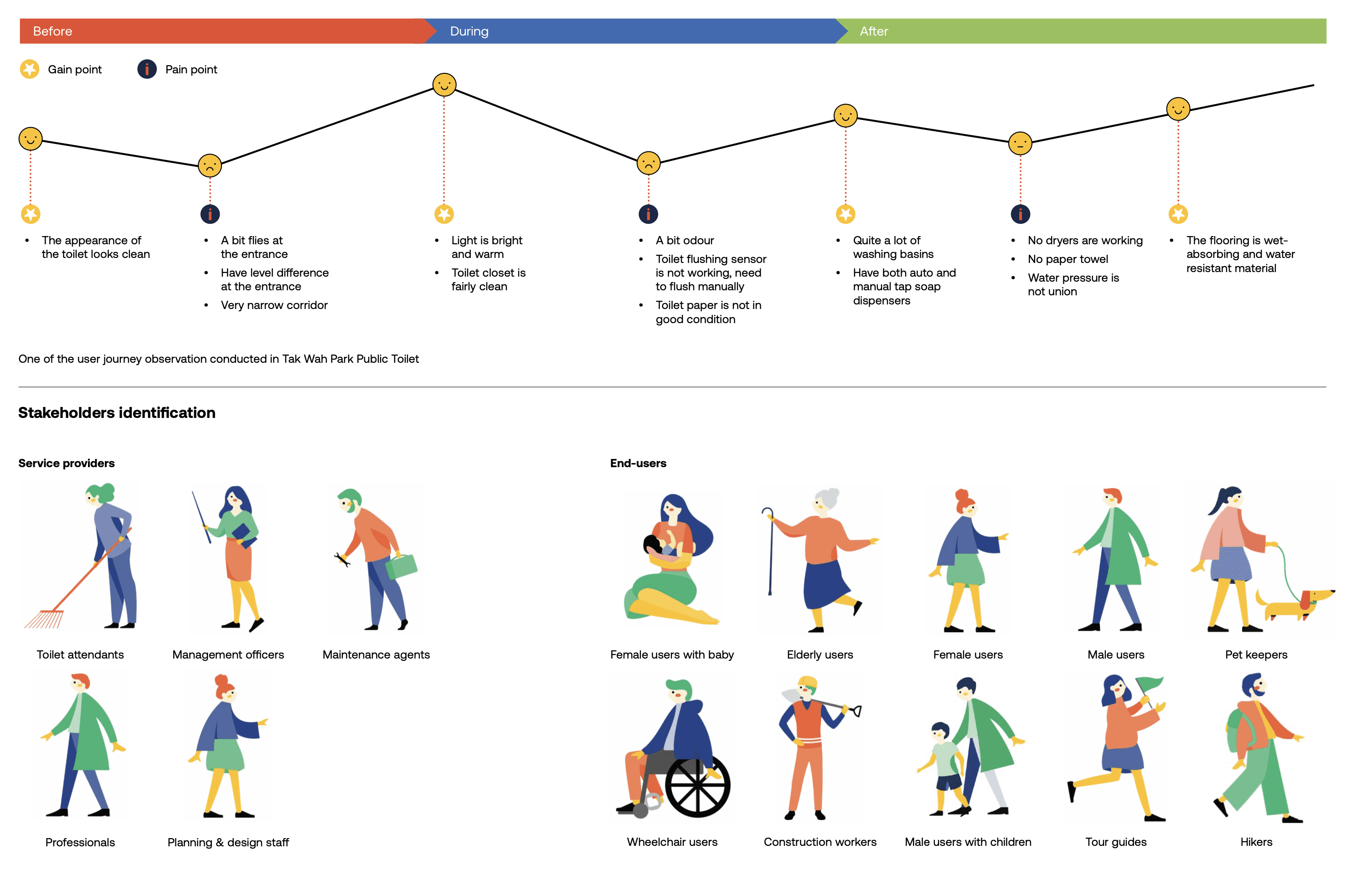 These issues are compounded by the diversity of users. Older adults, families with children, people with disabilities, cleaners, tourists and nearby residents all use the same facilities but with very different needs. The lack of a holistic service framework means these needs are often addressed in a scattered way.