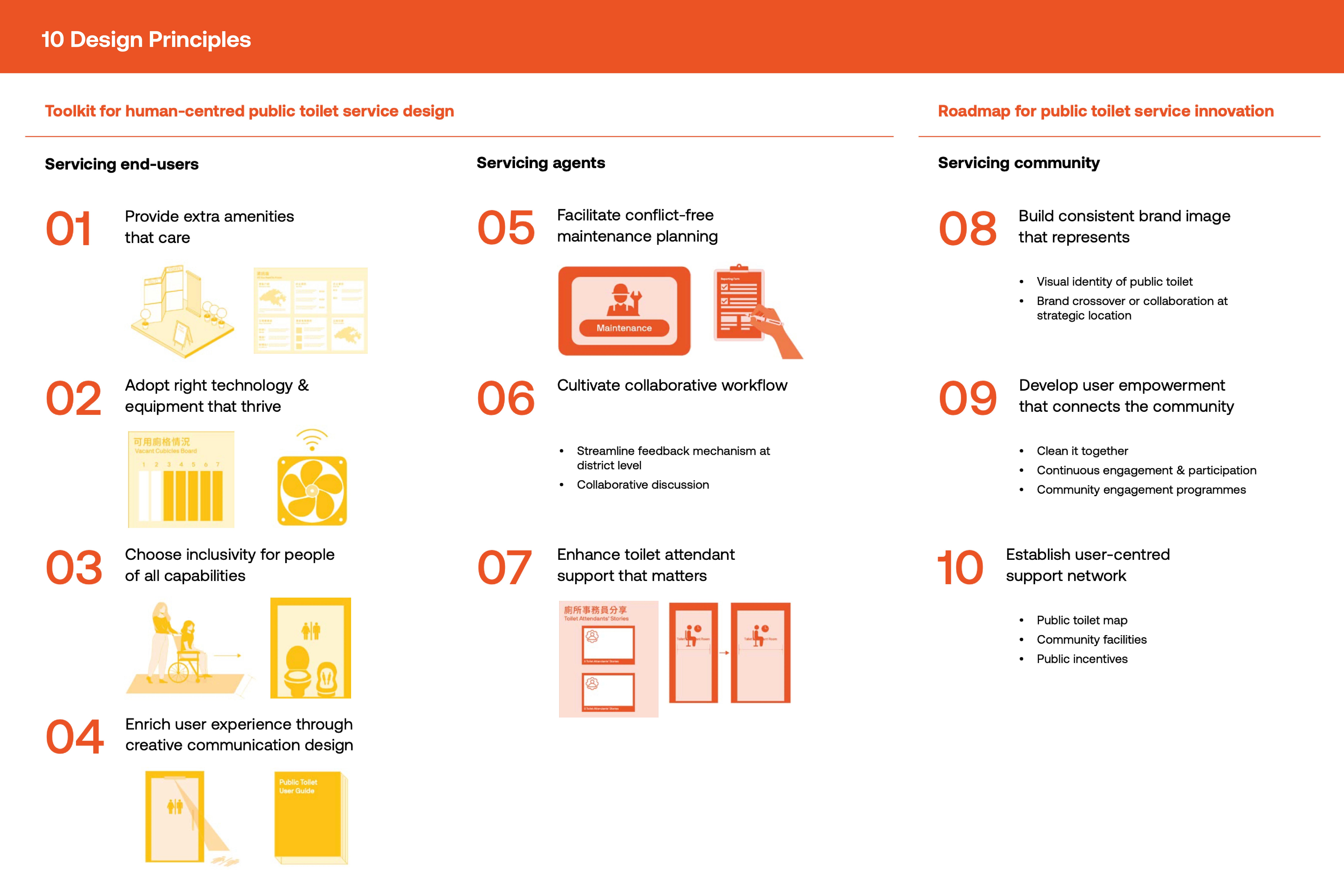 From these insights, ten design principles were developed to address the pain points and aspirations of users, staff and communities. These principles formed the foundation of two key outputs: the Toolkit for Human-centred Public Toilet Service Design and the Road Map for Public Toilet Service Innovation.