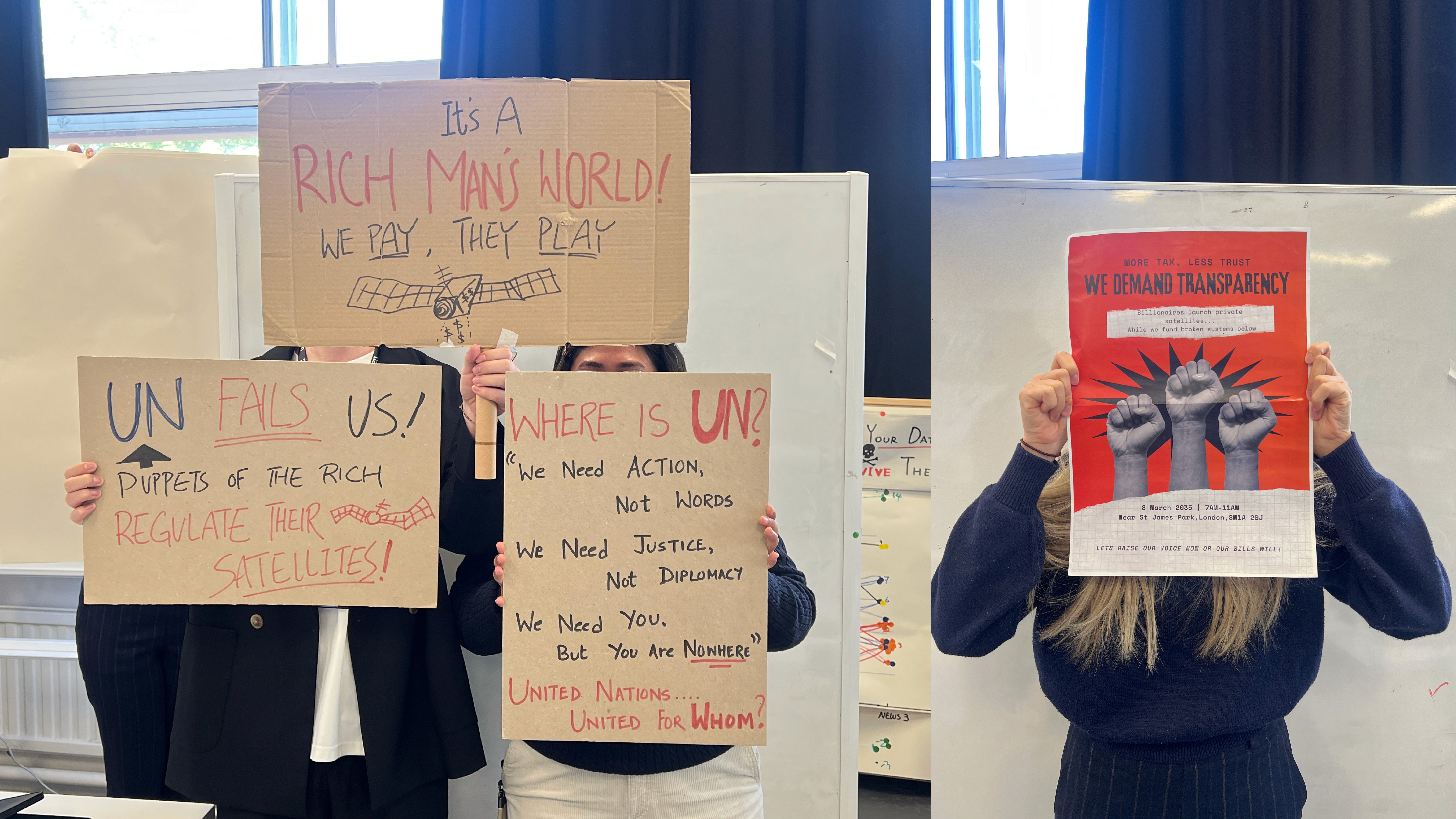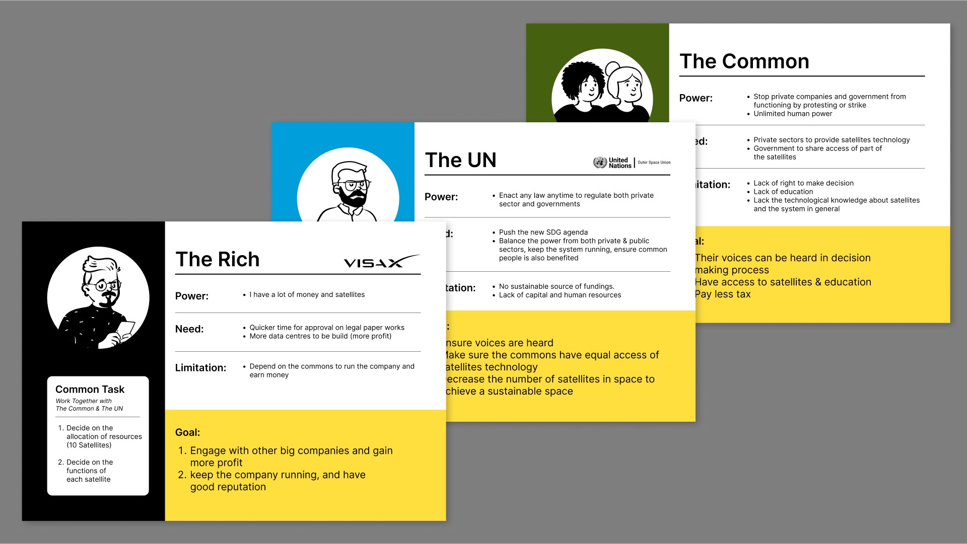 We organised a UN Conference role-play session, where participants adopted one of three fictional power roles: The Rich, The Common, and The UN. They were tasked with negotiating access to space, simulating debates around ownership, power, and regulation. Personas, goals, and constraints were designed to provoke empathy and reveal conflicting values.
